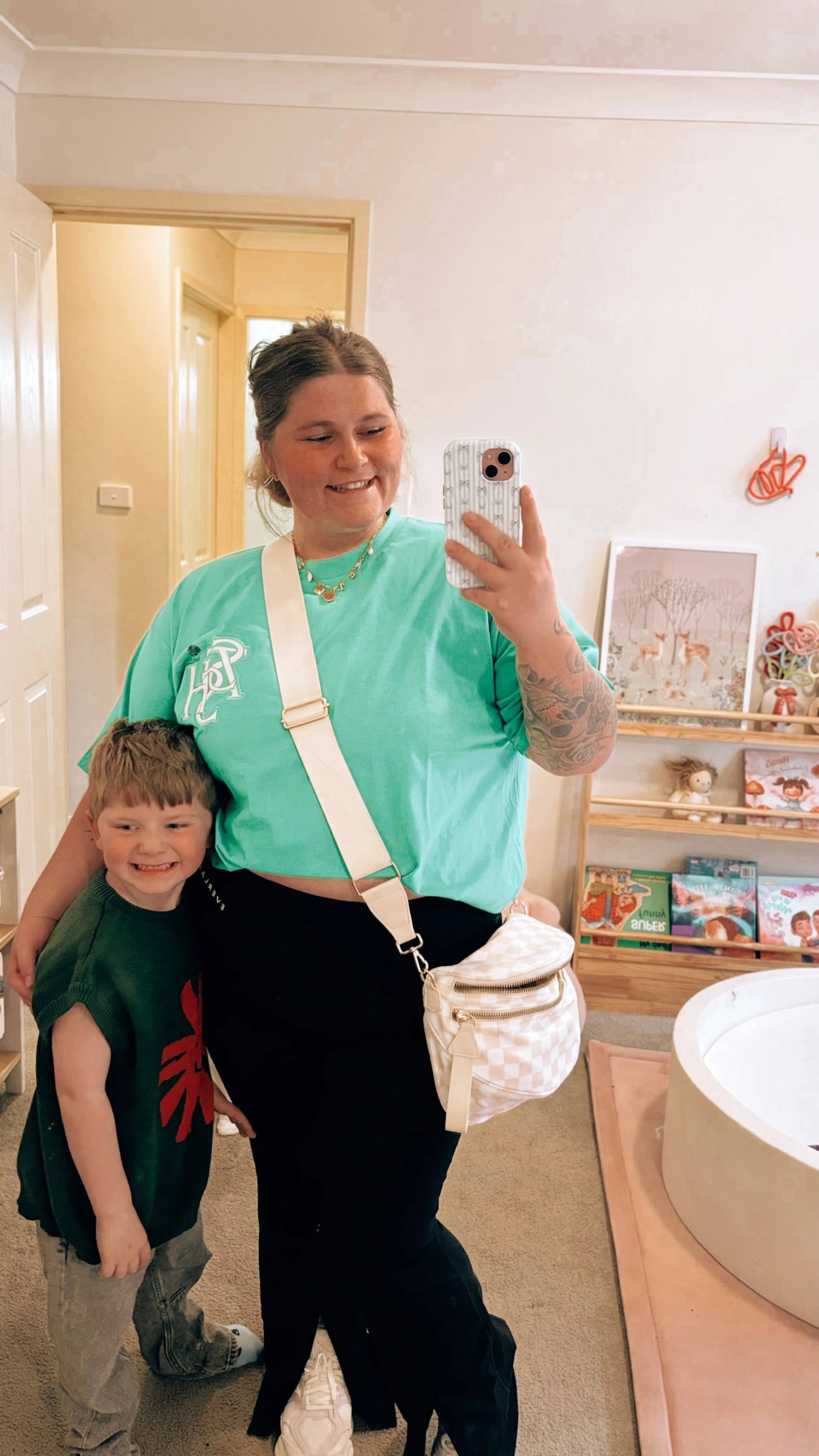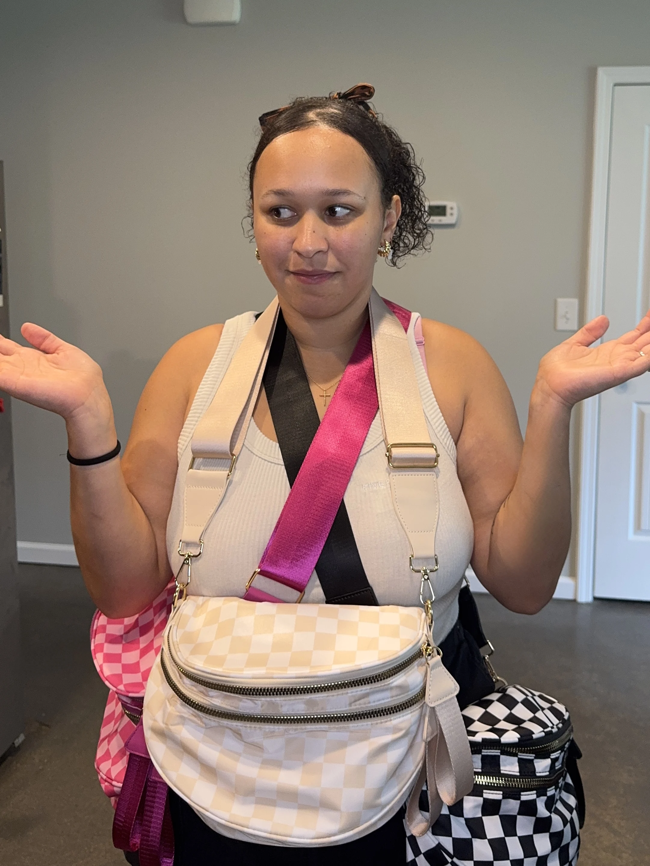 Holds everything a mom actually needs: 2 diapers, wipes, 2 water bottles, wallet, large phone, snacks, and more — all hands-free. Both the front and back pockets fit an iPhone Pro Max.