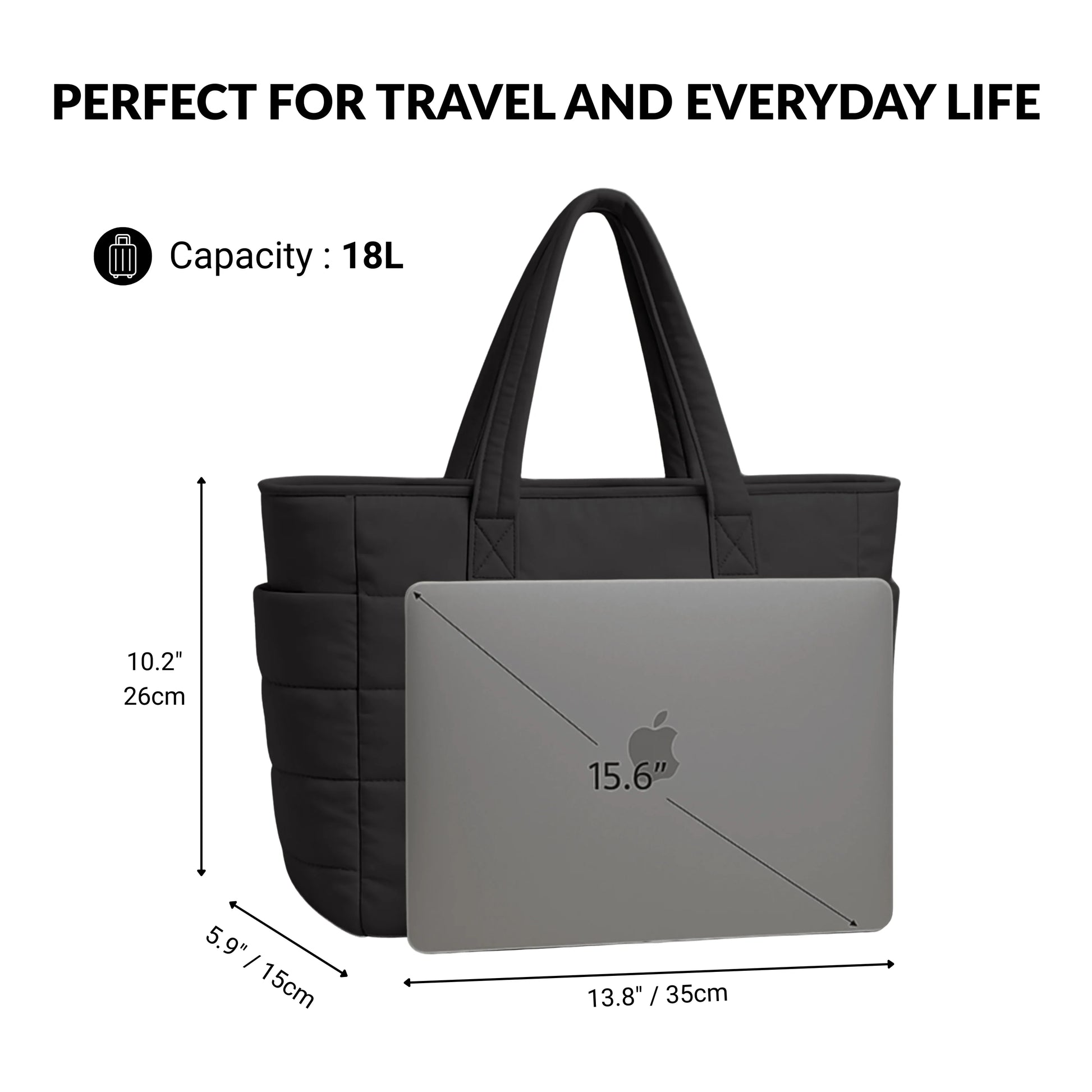Cloudy holds a 15.6" laptop, 1–2 bottles, charger, planner, wallet, phone, makeup pouch, snacks, and more — all organized across multiple compartments.