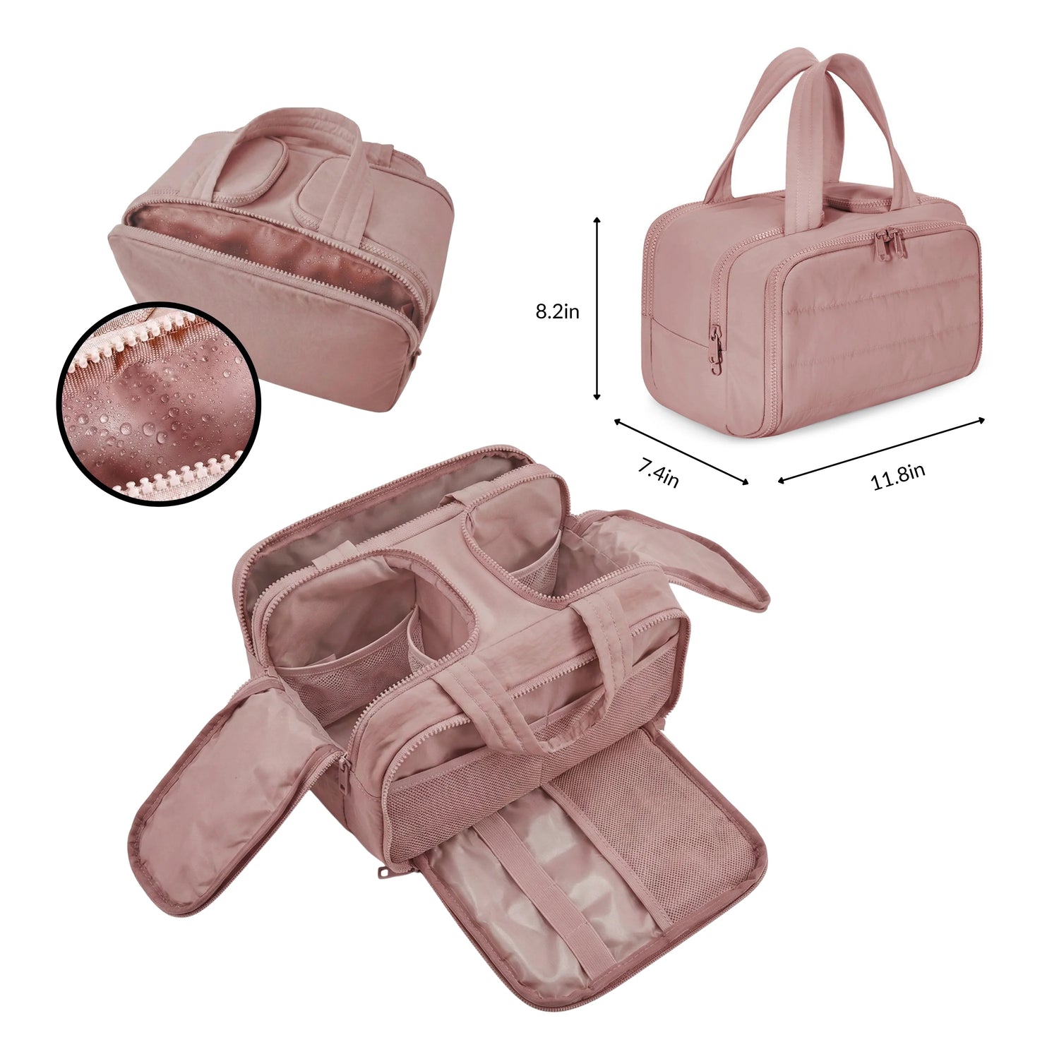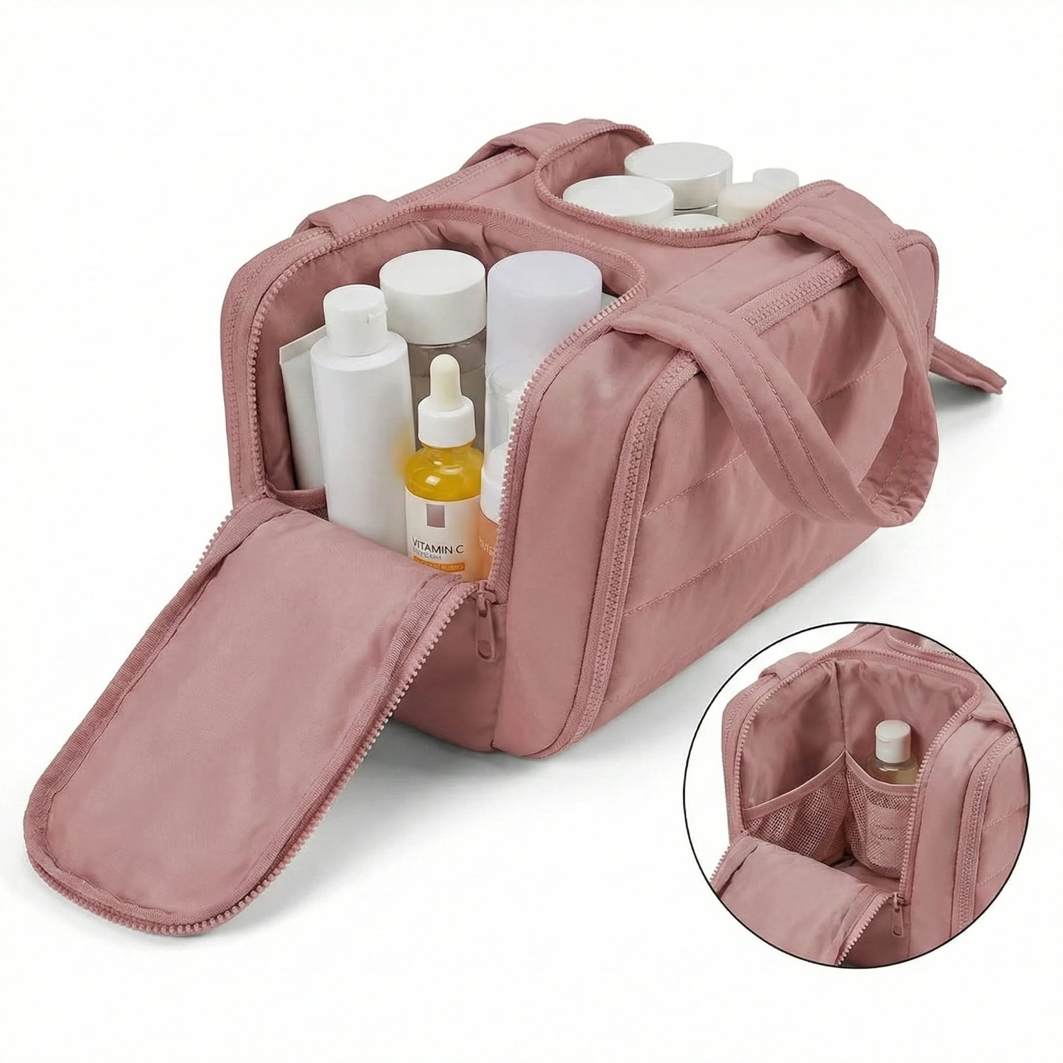 CrushKit isn't just spacious — it's smart about space. Four compartments keep skincare separate from makeup, brushes upright, and wet items isolated. No more digging through a black hole at 6 AM or dealing with leaky bottles in your suitcase.